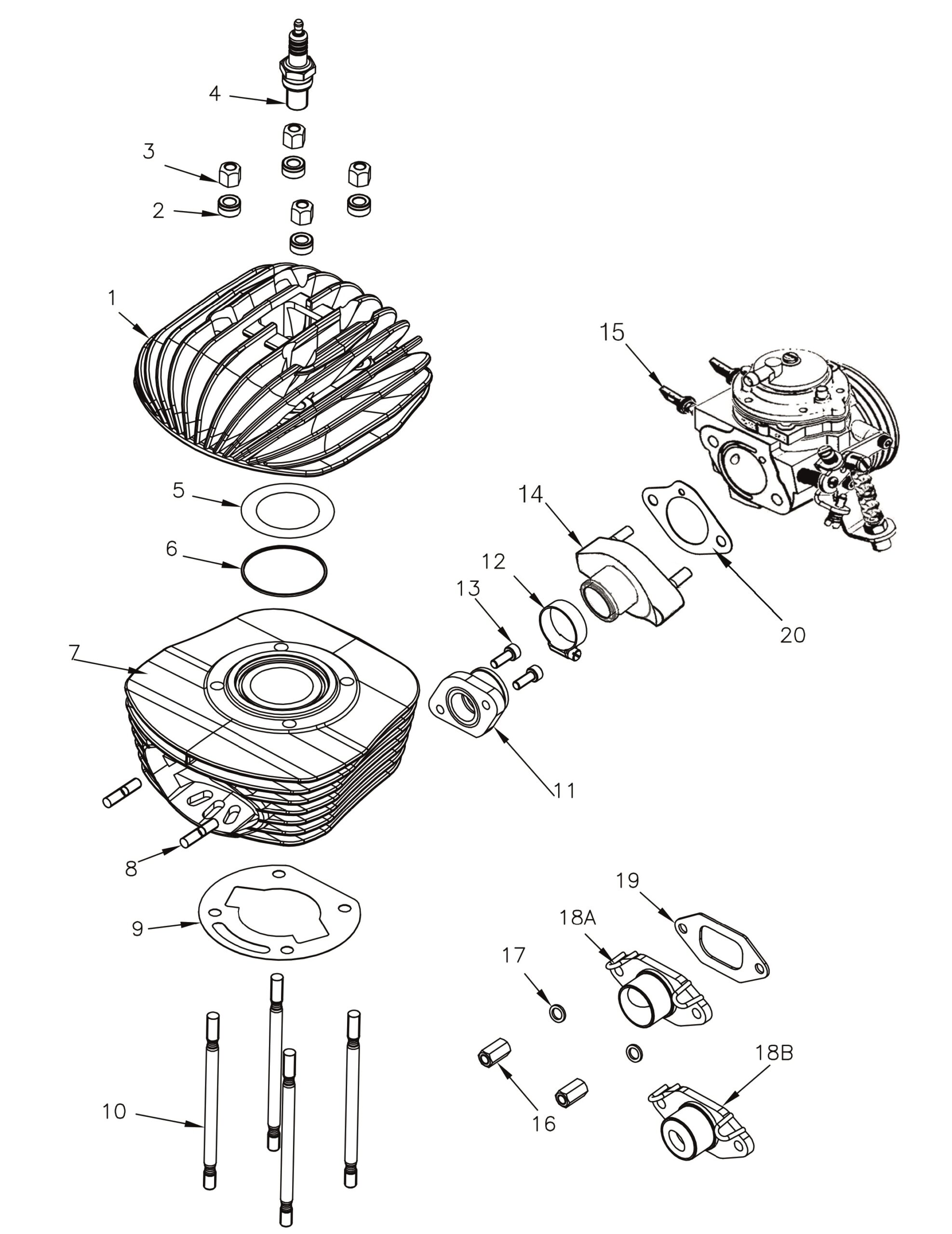 Mini Rok - S1 - Parts | 1 – Mini Rok air head, 2 – Head washer 8.5x15x8, 3 – Head-nut high-set M8 ZNB, 4 – Spark plug NGK b10 eg, 5 – Mini Rok/MR3 copper head gasket 42.2×62.4x 0.05, 5 – Mini Rok/MR3 copper head gasket 42.2×62.4x 0.1, 5 – Mini Rok/MR3 copper head gasket 42.2×62.4x 0.2, 6 – Kid-Mini Rok-Mr3 o-ring head 2212, 7 – Complete cylinder Mini Rok, 8 – Exhaust stud bolt M7x32, 9 – Mini Rok cylinder basis gasket 0.2, 9 – Mini Rok cylinder basis gasket 0.3, 9 – Mini Rok cylinder basis gasket 0.4, 9 – Mini Rok cylinder basis gasket 0.5, 10 – Cylinder stud bolt M8x142, 11 – Inlet manifold, 12 – Clamp 23/35mm, 13 – Socket-head screw M6x16, 14 – Intake manifold spacer for Tillotson carburettor, 15 – Tillotson carburettor HW-48A, 16 – Nut M7, 17 – Exhaust washer 8x12x1.5, 18A – Standard Mini Rok exhaust manifold, 18B – Mini Rok exhaust manifold d.16mm (option), 19 – Mini Rok exhaust gasket, 20 – Tillotson carburettor gasket |